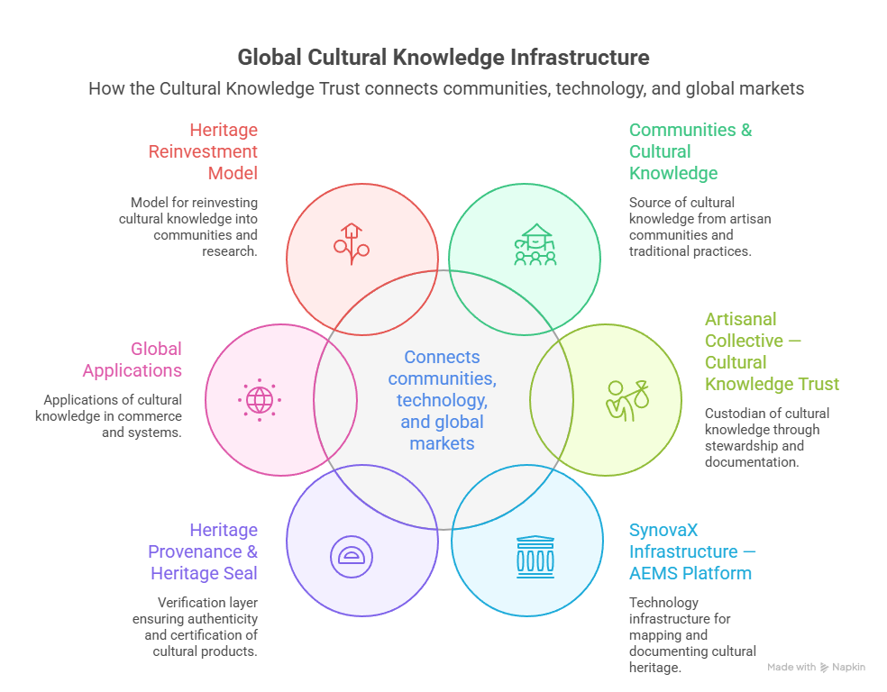 The Artisanal Collective Cultural Knowledge Trust establishes a global infrastructure to document, verify, and activate cultural knowledge, ensuring that communities benefit from the value created.