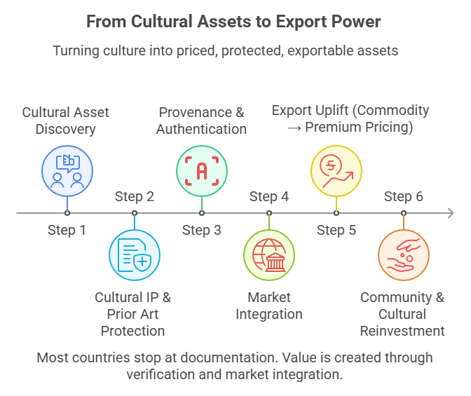 Cultural knowledge moves from documentation to verification and market integration—unlocking export-ready economic value.